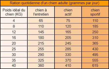 Pour définir la ration quotidienne de votre chien : Référez-vous au tableau sur votre paquet de croquette. Notez que celui-ci est un guide, et non une science absolue. Il vous est tout à fait possible d'adapter la quantité indiquée aux besoins de votre chien.