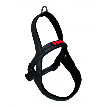 Le harnais Kong est fait dans un nylon solide et son rembourrage en néoprène offre robustesse et durabilité tout en étant très confortable pour votre animal. Tour de poitrail (sangle de devant) n'est pas réglable, seul le tour de poitrine est réglable (sangle du dessous). Il comporte une poignée rembourrée supplémentaire sur le dessus en cas de besoin d'un contrôle rapide. Un anneau métallique se trouve également sur cette poignée pour permettre d'y attacher votre laisse. Le harnais dispose également de deux bandes de coutures réfléchissantes pour la visibilité nocturne.