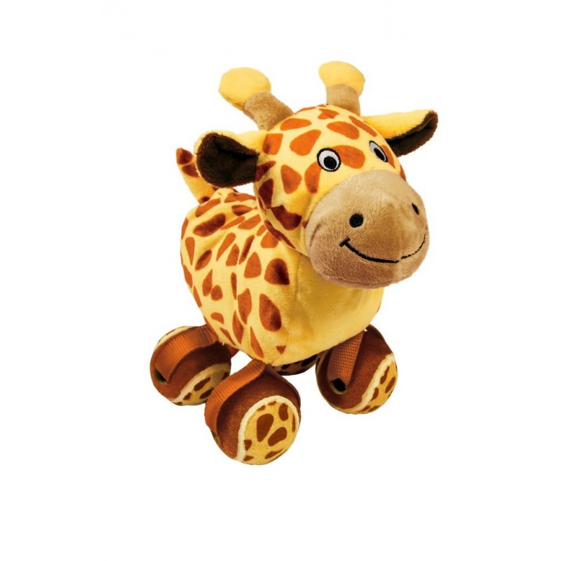 Le jouet Tennis Giraffe de KONG est doté de quatre petites balles de tennis à la place des pattes. leurs mouvements imprévisibles incitent le chien à jouer avec et à le secouer instinctivement, pendant que le couineur encourage le chien à mâchouiller.